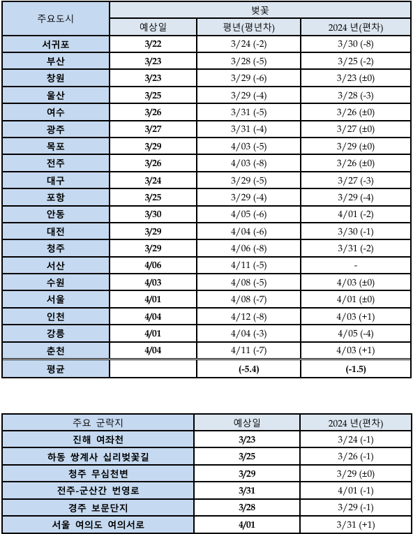 2025년 지역별 벚꽃 개화 및 만개 예상 시기